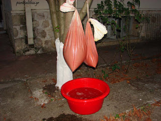 κρεμάμε ψηλά για να στραγγίσουν τα υγρά και αυτό που μένει το βράζουμε καλά σε
